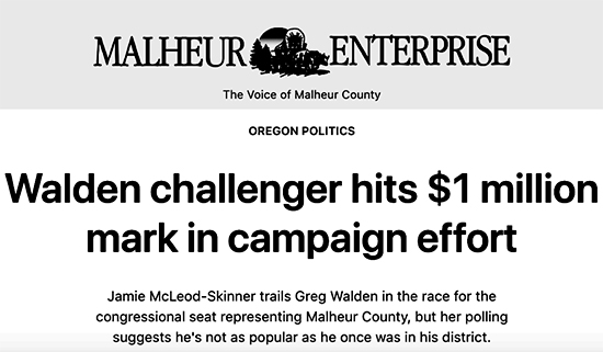 Jamie Supporters -- Jamie McLeod-Skinner's campaign is generating unprecedented levels of excitement in Oregon's 2nd Congressional District, and across our entire state. That's why I wanted to share this note from Jamie's campaign director. Over the course of this campaign, Jamie has logged tens of thousands of miles traveling in her Jeep across the district, talking with voters and making the case for why they should vote for her in this year's critical elections. And in these final days of her campaign, the support you can give to Jamie and her team could make the difference. Take a look: